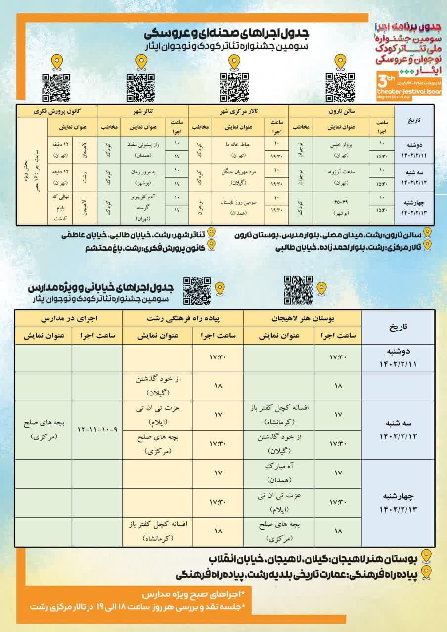 جانشین دبیر جشنواره ملی تئاتر کودک و نوجوان ایثار همچنین از برگزاری اختتامیه جشنواره در روز پنجشنبه ۱۴ اردیبهشت در تالار مرکزی رشت خبر داد و گفت: ویژه برنامه ” بچه های آسمان” نکوداشت شهدای خردسال استان گیلان نیز روز چهارشنبه از ساعت ۱۸ عصر در پیاده راه فرهنگی شهرداری رشت برگزار می شود.