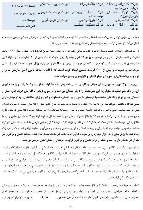 این درحالی است که تفاهم ایجاد شده بین بندرشهیدرجایی و شرکت مذکور ( از مجموعه شرکتهای بنیاد مستضعفان) برخلاف تاکید مقام معظم رهبری پیرامون عدم حضور شرکتهای حاکمیتی در معاملاتی است که امکان حضور بخش خصوصی وجود دارد نیز هست و در حالی که انجمن شرکتهای سرمایه گزار ترمینالهای نفتی خصوصى امادگی خود را برای شرکت در دو بخش ساماندهي وضعيت موجود و نيز مشاركت در بخش توسعه ( جديد)طرح موضوع این قرارداد طبق تشریفات معاملات دولتی در رقابتي سالم و شفاف در قالب کنسرسیوم اعلام کرده اند اما بندرشهیدرجایی بدون در نظر گرفتن الویت شرکتهای خصوصی که سالها در این بندر با هزینه شخصی این ترمینالها را تجهیز کرده اند، ضمن ترک تشریفات کمیسیون معاملات این تفاهم را با یک شرکت بنیاد مستضعفان بازمسئوليت محدود منعقد کرده است ، ( تصويب تا امضا وابلاغ از ٩ تيرماه ١٤٠٣ تا ١٤٠٣/٠٤/٢٣-كمتر از دوهفته)، سرمایه گزاران که تا پیش از این خدمات انتقال نفت و مشتقات را به از طريق مستحدثات و زيرساخت هاي سرمايه گذاري شده خود انجام می داده اند، حال با اعطاي امتياز ويژه و خارج از رقابت شفاف اجرای این قرارداد ، اداره كل بنادر و دريانوردي بصورت قهرى تاسيسات بارگيري فعالين اين بخش را بدون اذن مقام قضايي و با وجود بقاء رابطه تعهدي نهاد سرمايه پذير( بندر) و نهاد سرمايه گذار( بخش خصوصي)،تصرف و جهت بهره بردارى به شركت خصولتي مورد نظر خود اعطا نموده و مي نمايد، اين اقدام خلاف قانون و حقوق مكتسبه سرمايه گذاران واقعي توسط بنادر و دريانوردي ،موجب تحمیل هزینه های سنگین به ترمينال داران نفتی – که بیشتر آنها شرکتهای خصوصي هستند و ذينفعان آن ها كه صادركنندگان دولتي و غير دولتي هستند- می شوند از طرفی دیگر این طرح توسعه قرار بوده با سرمایه گزاری شرکت مذکور به روش(BOT) اجرا شود که در بدعتي شگفت انگيز بااخذ درآمد قبل از شروع به ساخت وبدون هیچگونه سرمایه گزاری و ازمحل تصرف قهري داراييهاي بخش خصوصي فعال نفتي هرمزگان آغاز شده است و به عبارتی دیگر میتوان اینکونه مثال زد که شرکت طرف قرارداد عوارضی جاده ای را می گیرد که هنوز يك ريال براي ساخت آن نپرداخته و از خلق دارايي بخش خصوصي بيچاره و بدون اذنش استفاده مي برد.