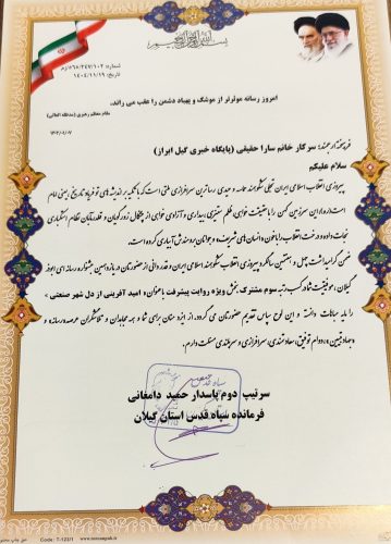 نقش شما در پاسداری از ارزش‌ها و آرمان‌های انقلاب اسلامی و جهاد تبیین، شایسته تقدیر است و حضور موفق شما در جشنواره رسانه‌ای ابوذر گیلان و کسب رتبه دوم بخش ویژه روایت پیشرفت با عنوان «از اعماق دریا تا سفره»، گواهی بر تعهد، تخصص و تلاش شبانه‌روزی فعالان این عرصه است.